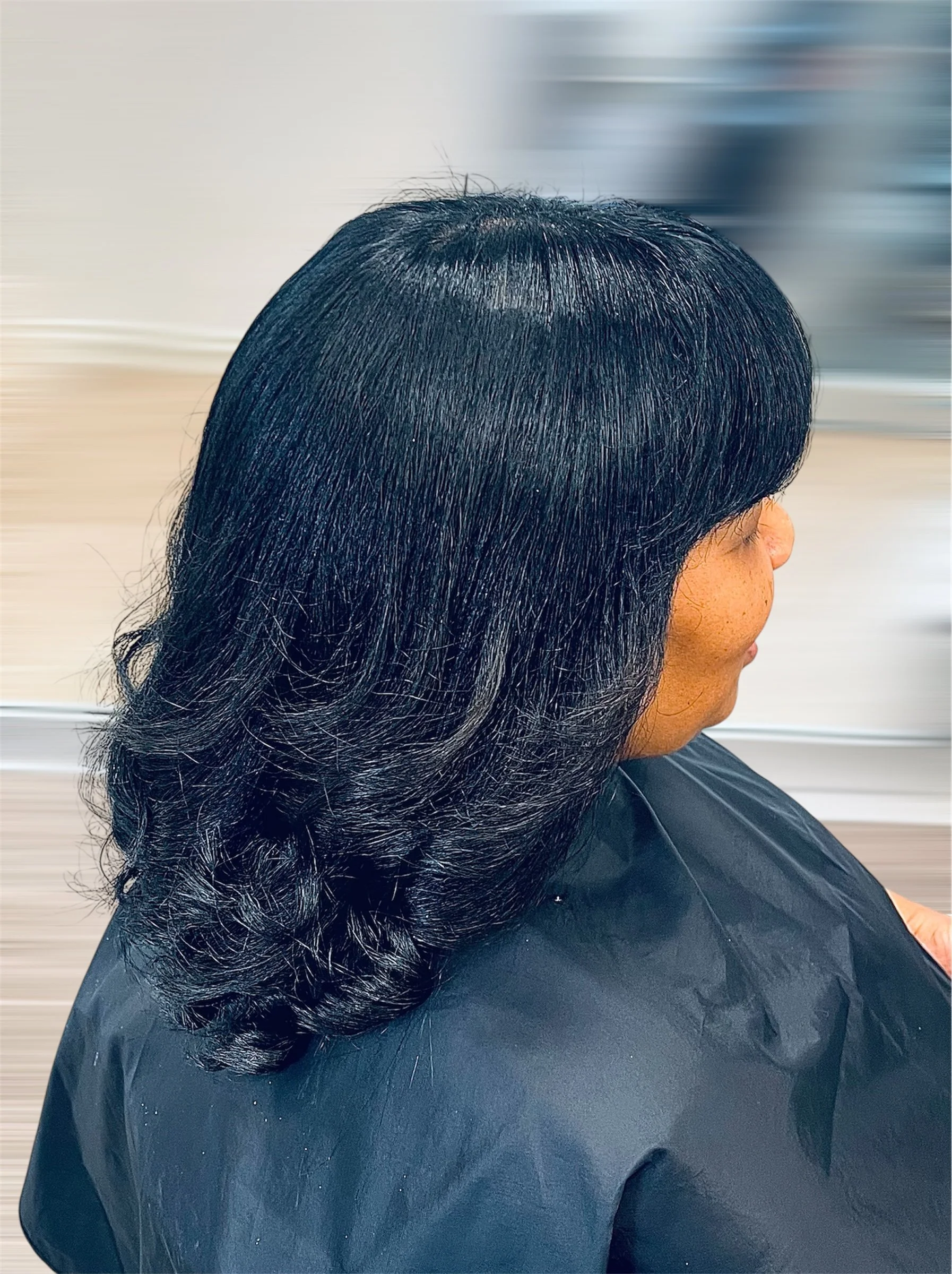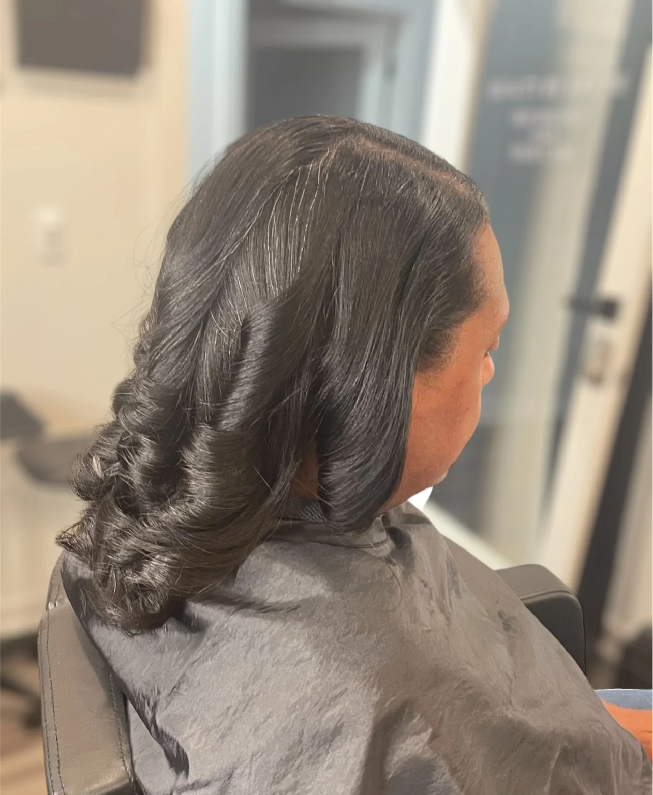 A woman with long, dark, shiny, wavy hair sitting in a salon chair, facing sideways.