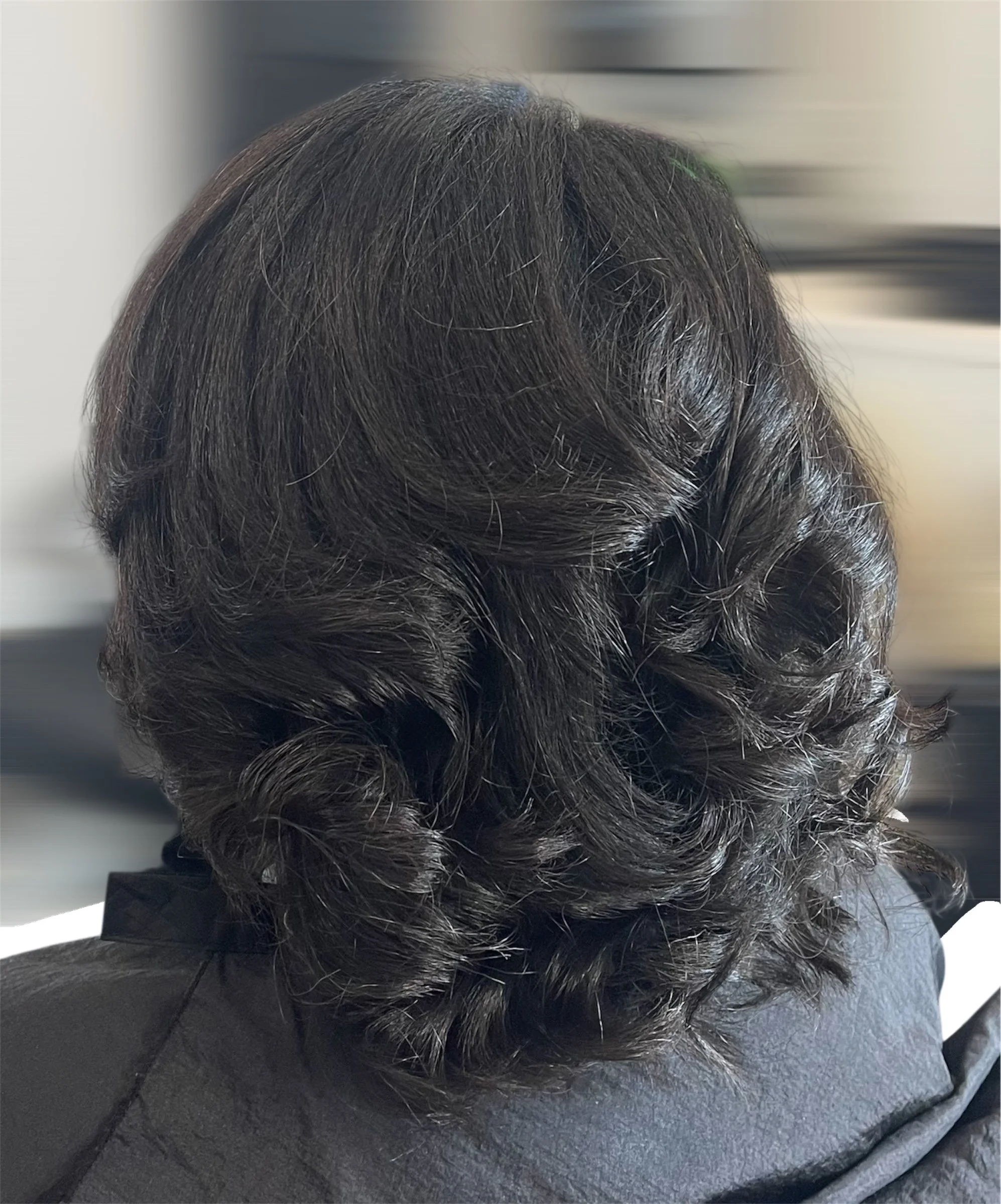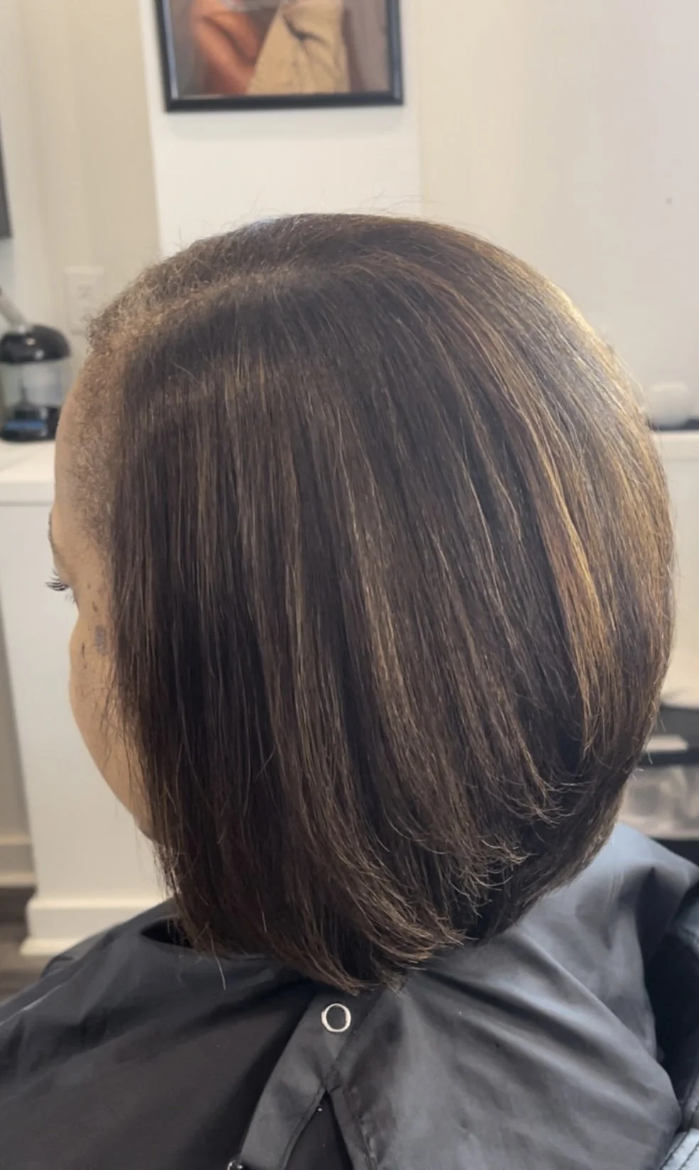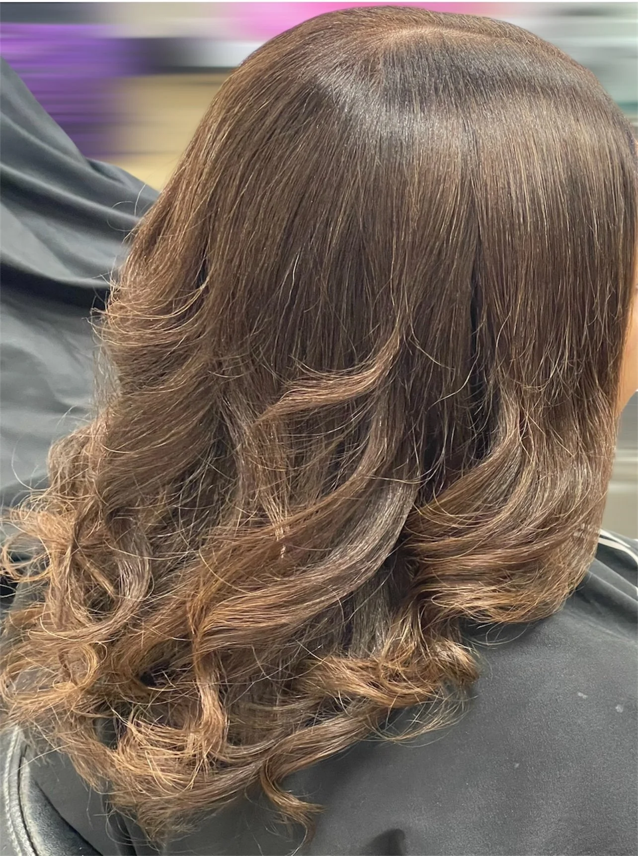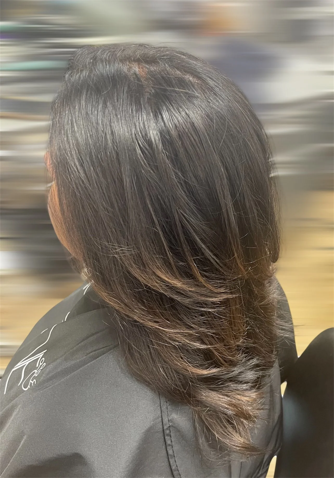 The image shows a woman with shoulder-length, dark brown hair with lighter brown tips, partially styled in loose waves, sitting in a salon chair wearing a black salon cape.