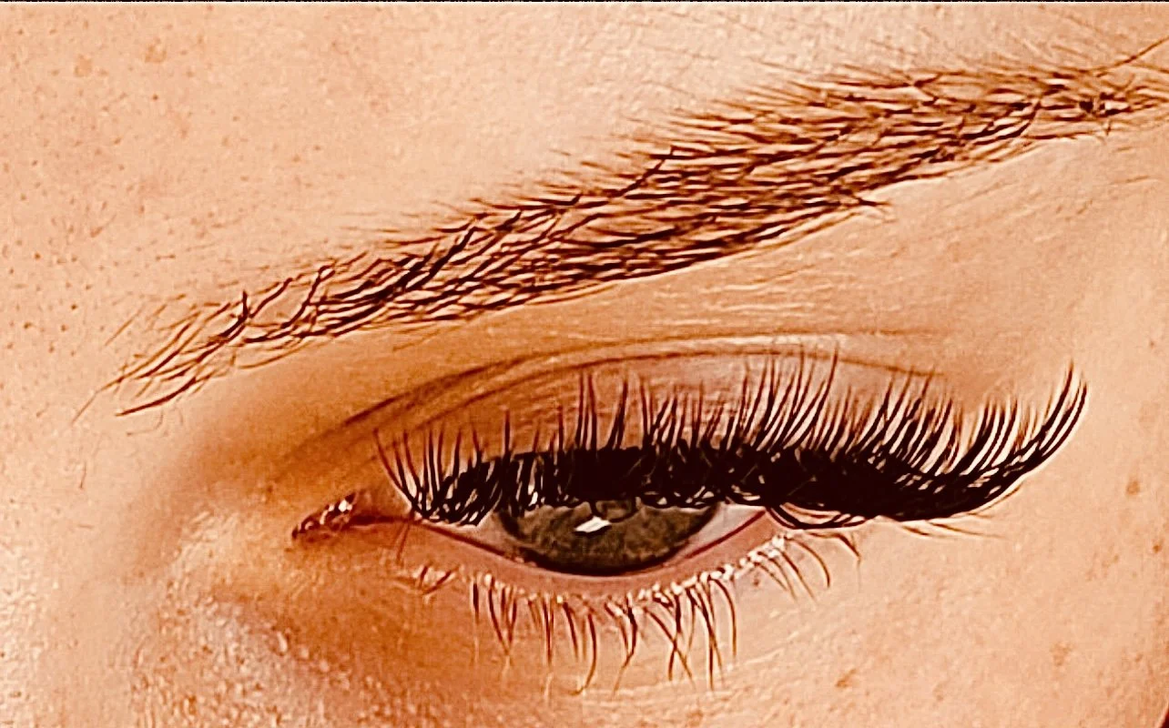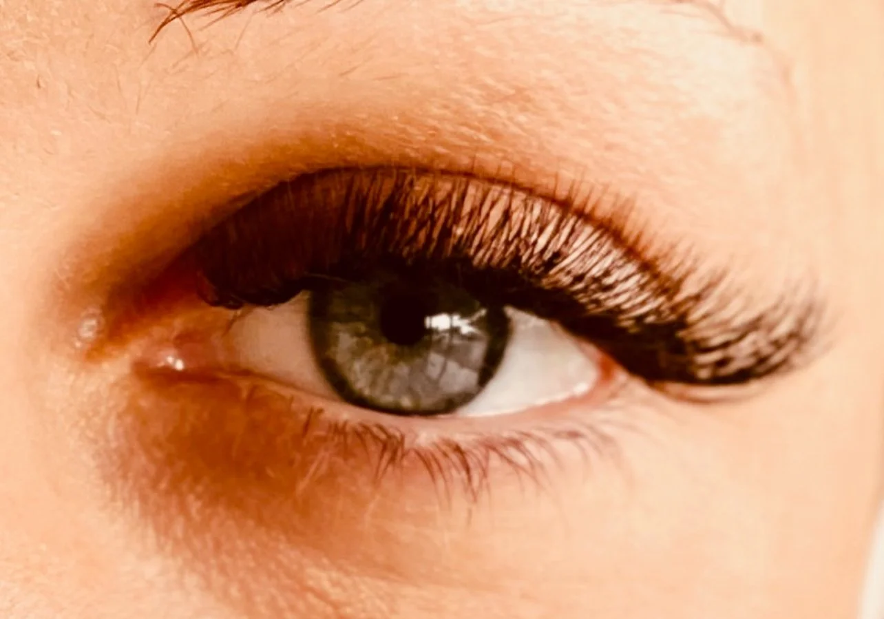 Close-up of a person's eye with long, thick eyelashes and well-groomed eyebrows.