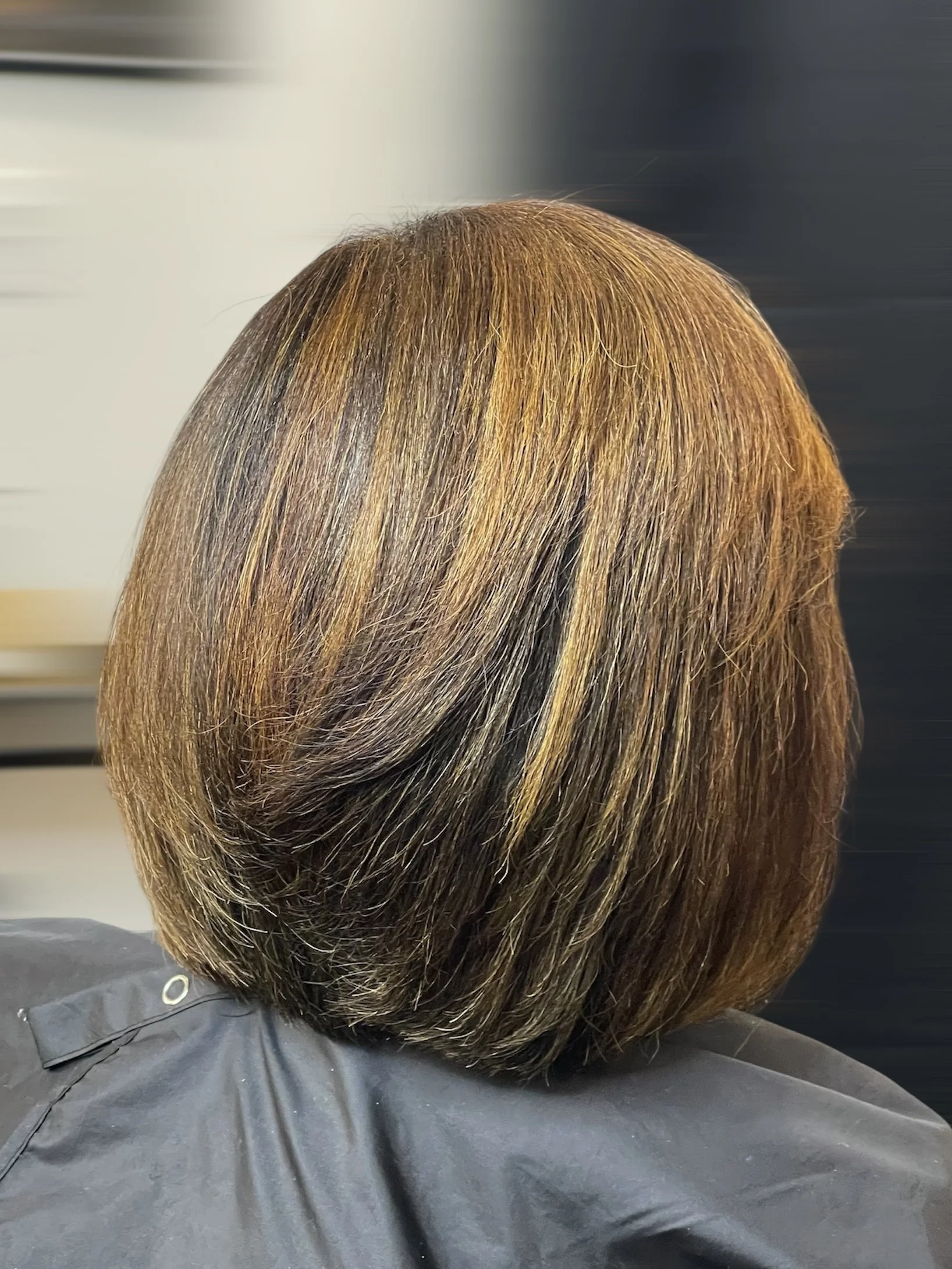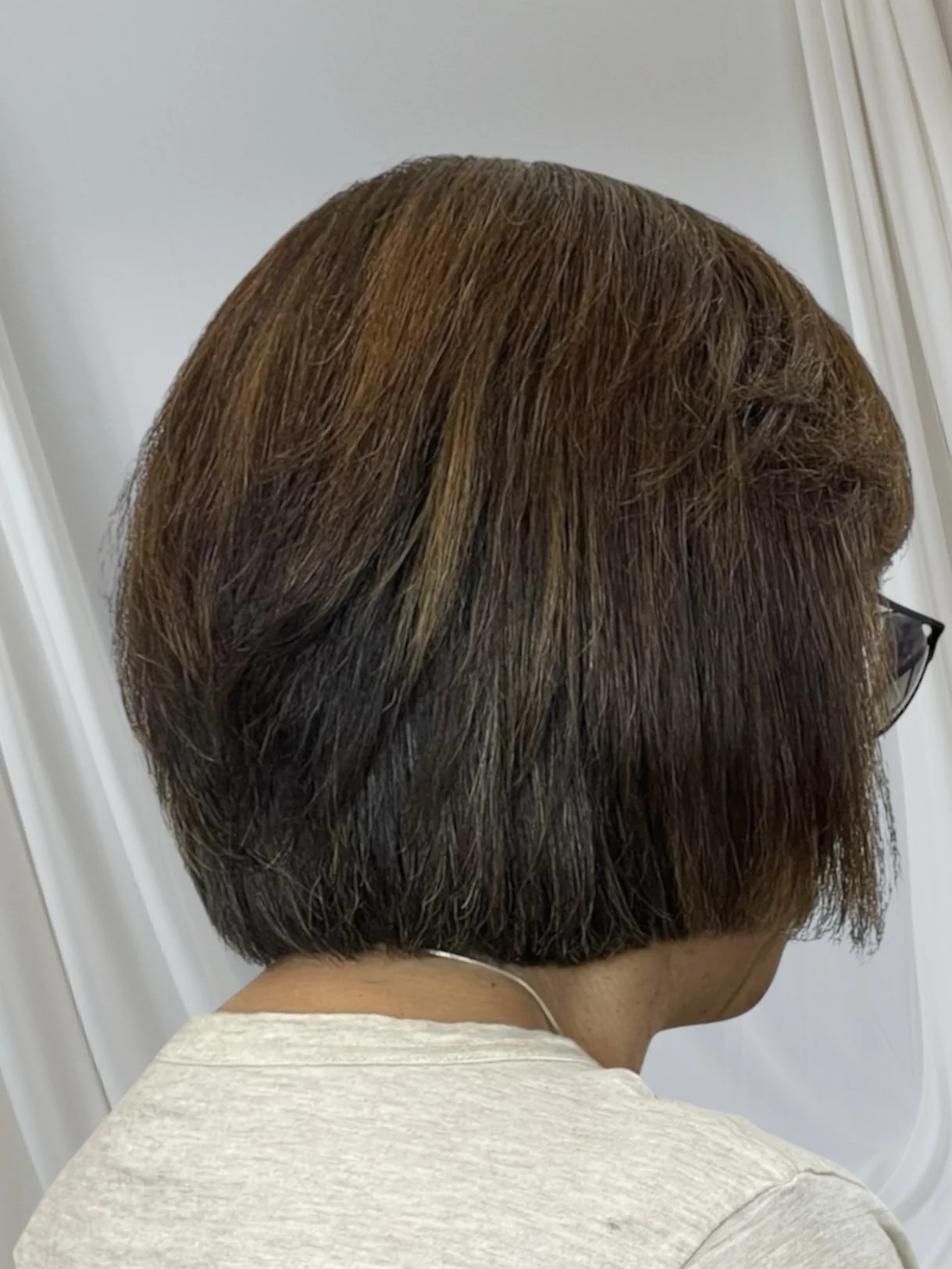A woman with a fresh haircut showing a layered bob style with blended brown hair.