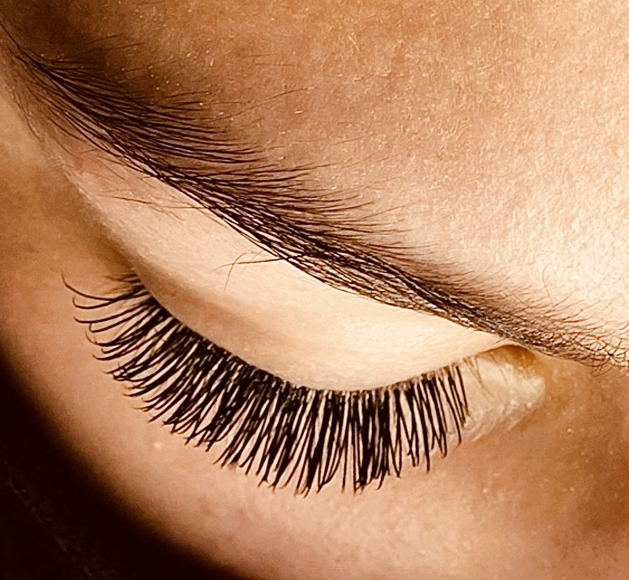 Close-up of a person's closed eye showing long, curled eyelashes and well-groomed eyebrows.