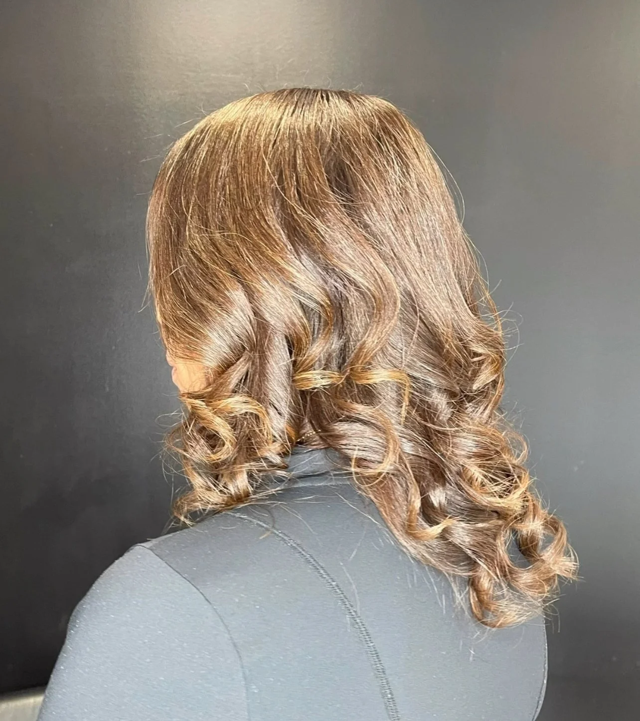 The image shows a hairstyle with shiny, styled brown hair featuring soft curls.