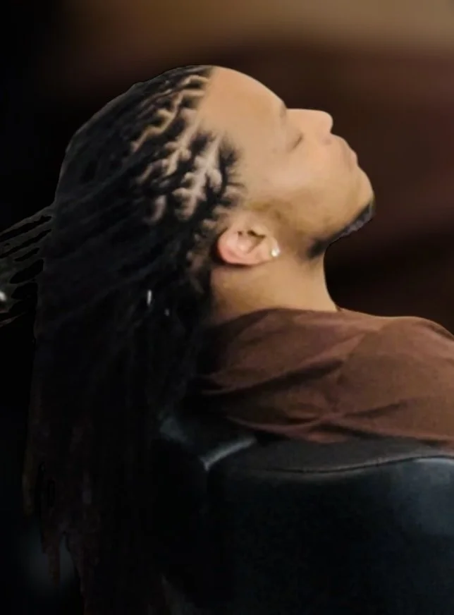 Side view of a woman with long braided hair, closed eyes, and a relaxed expression, sitting in a dimly lit environment.